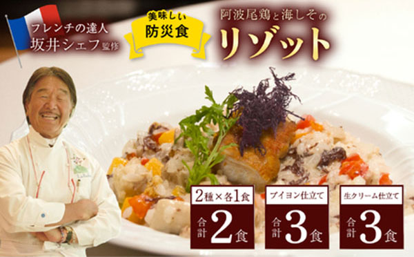 開発中の防災食は、「料理の鉄人」として知られる、フランス料理「ラ・ロシェル」オーナーシェフ・坂井宏行氏監修の『阿波尾鶏と海しそのリゾット』。